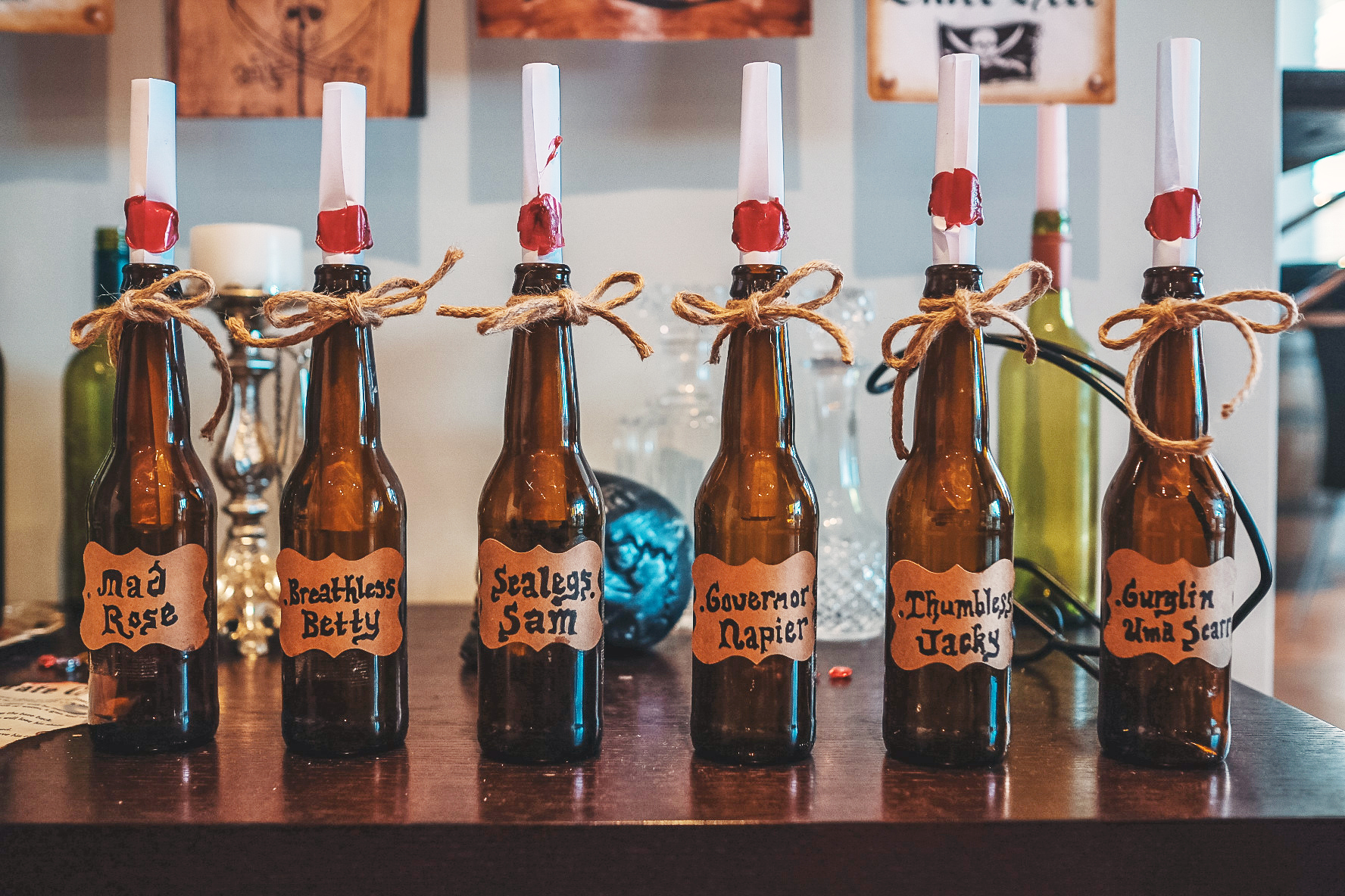 - Pirate themes: aged parchment, twine, dark glass bottles