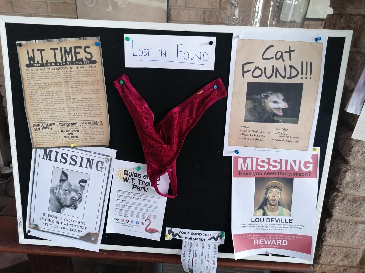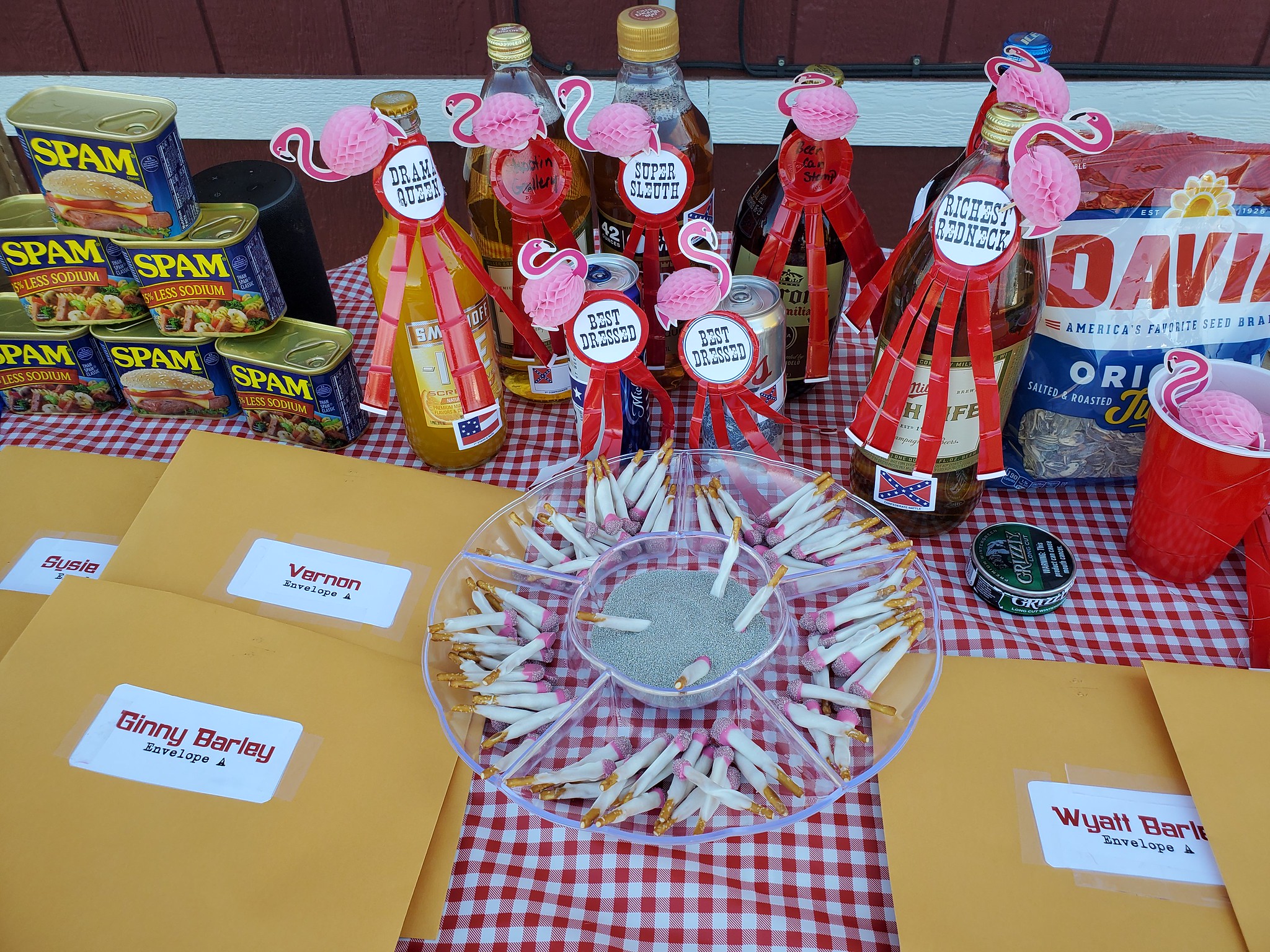 This host went all in—transforming their garage door into a full-on trailer front using painted cardboard, paper flowers, and outdoor flamingos. It shows how far you can go with craft supplies and a theme you love. Party signs on the door and lawn (including Night of Mystery’s free printable signage) helped guests instantly buy into the trailer park world. Check Out Trailer Park Tragedy Here.