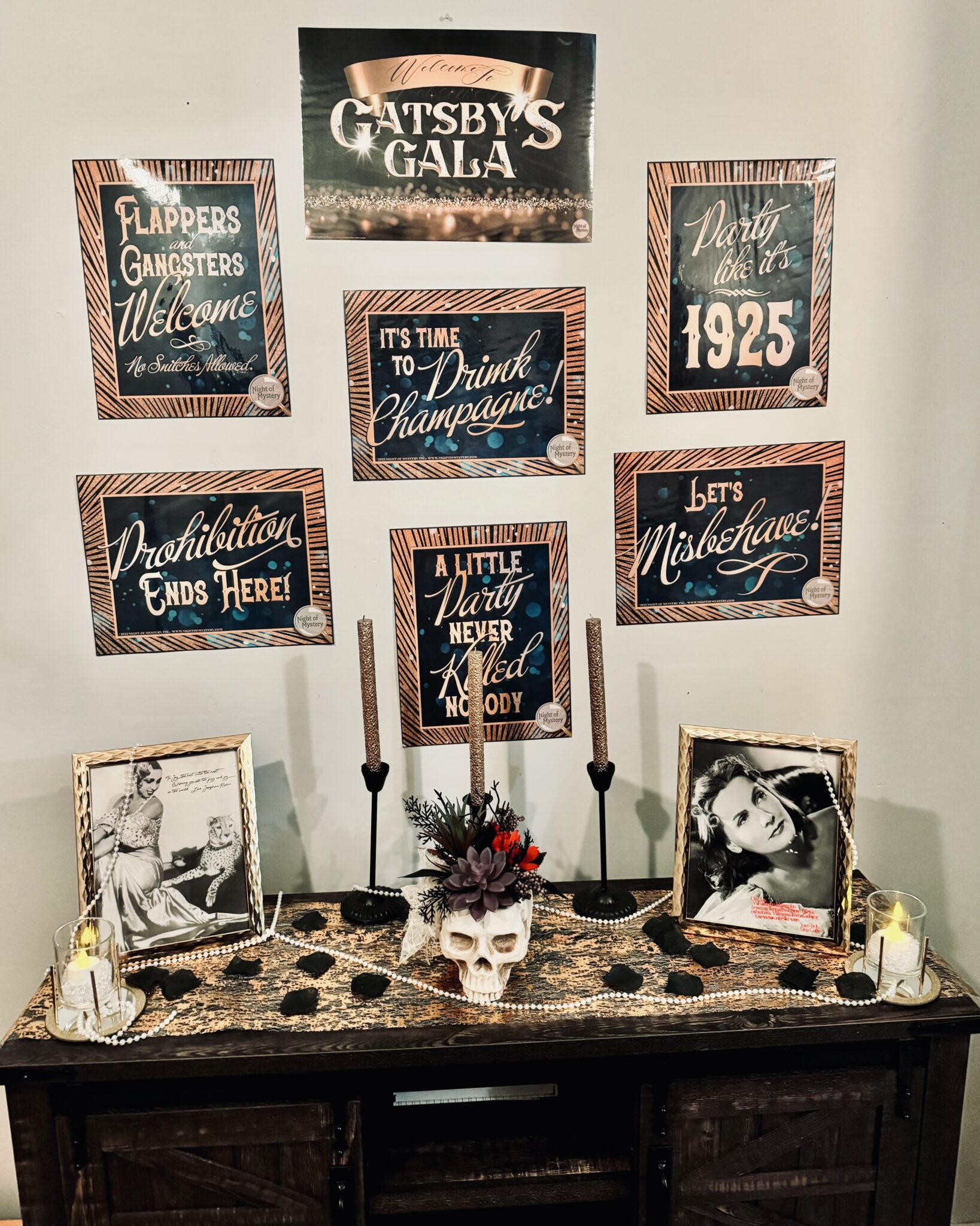 A plain wall became an Art Deco dream thanks to Night of Mystery’s printable poster pack and vintage photos (included with the mystery game). The host then complimented the wall of printables with a faux skull with florals, black candles, and a dollar-store string of pearls turned a simple console table into a classy (and slightly creepy) welcome station. The host then set up a blank wall with a tinsel backdrop for a simple, elegant photo station. If this is your vibe, check out Murder at Gatsby’s Gala here.