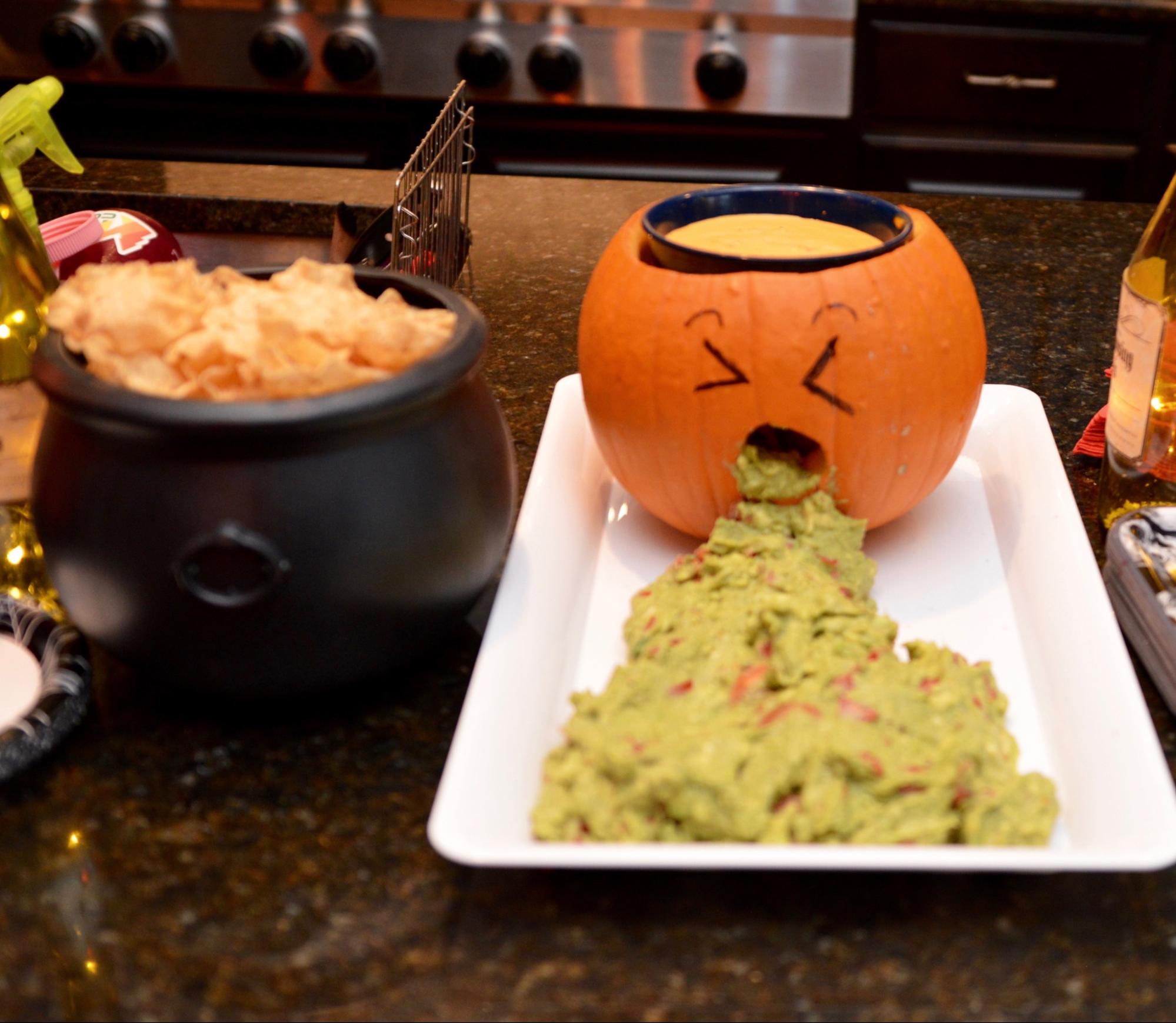- Add the “puke”: Spoon guacamole out of the pumpkin’s mouth so it looks like it’s spilling out. Let it flow onto the platter in a messy pile.